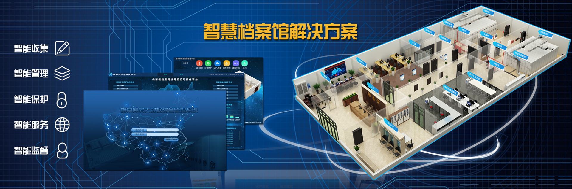 國韻根據(jù)山東省委宣傳部檔案管理的實(shí)際需求,為其設(shè)計(jì)建設(shè)了檔案庫房智能化綜合管理系統(tǒng),該系統(tǒng)將溫濕度自動測控、智能防火、智能防盜、消毒滅菌等檔案保護(hù)功能集成于綜合管理平臺,實(shí)現(xiàn)了檔案保護(hù)管理的智能化。該項(xiàng)目改善了山東省委宣傳部檔案庫房的環(huán)境,強(qiáng)化了對檔案的管理和保護(hù)。